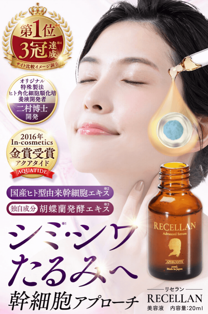 RECELLAN(リセラン)はヒト幹細胞エキスを配合した、幹細胞コスメです。日本人のヒト幹細胞培養液を採用。特許取得原料である、アサイヤシ発酵液を培養エキスとして使用しています。アサイヤシ発酵エキスには、メラニン色素の生成を抑制する働きもある。