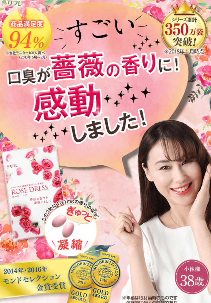 ローズドレスは、口臭が薔薇の香りに変わるブレスケアサプリ。ダマスクローズオイルを含むバラの香り成分101mgに話題のエチケット成分、柿抽出物(柿渋)配合の、実感力にこだわったバラのサプリ登場です。